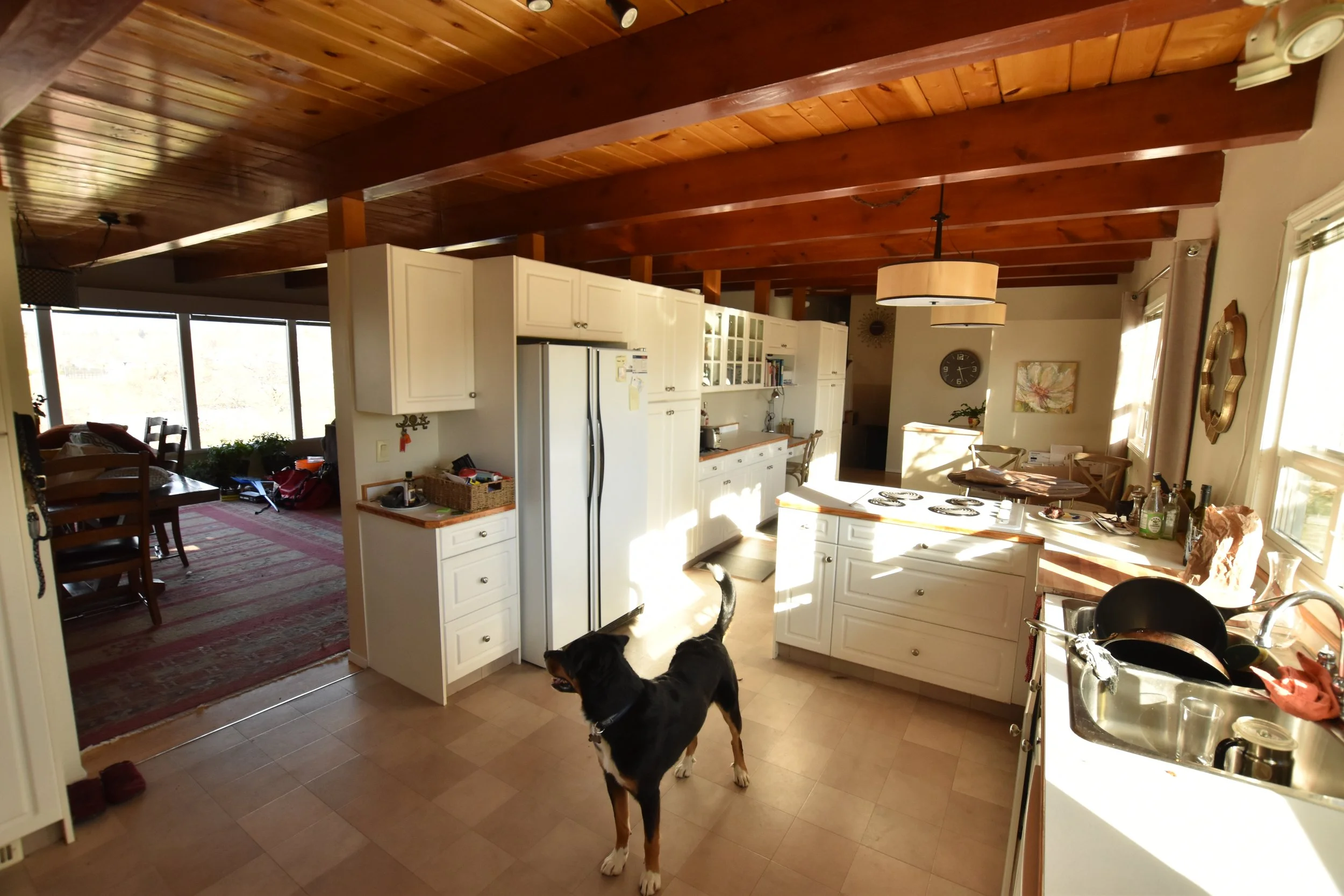 We brought this midcentury post and beam home into the twenty-first century. The customer had a great vision for what they wanted. The living room wall was end to end windows with fantastic views to the wall separating the kitchen from the rest of the home was removed and replaced with a laminated timer beam. A large island is perfect for entertaining and we built a custom curved range hood to the customers specifications with walnut accents to match the countertops. The gas fireplace was completely torn down and replaced with an electric fireplace and sunken tv nook. We used a large fir timber for the mantle and porcelain tile across the hearth.